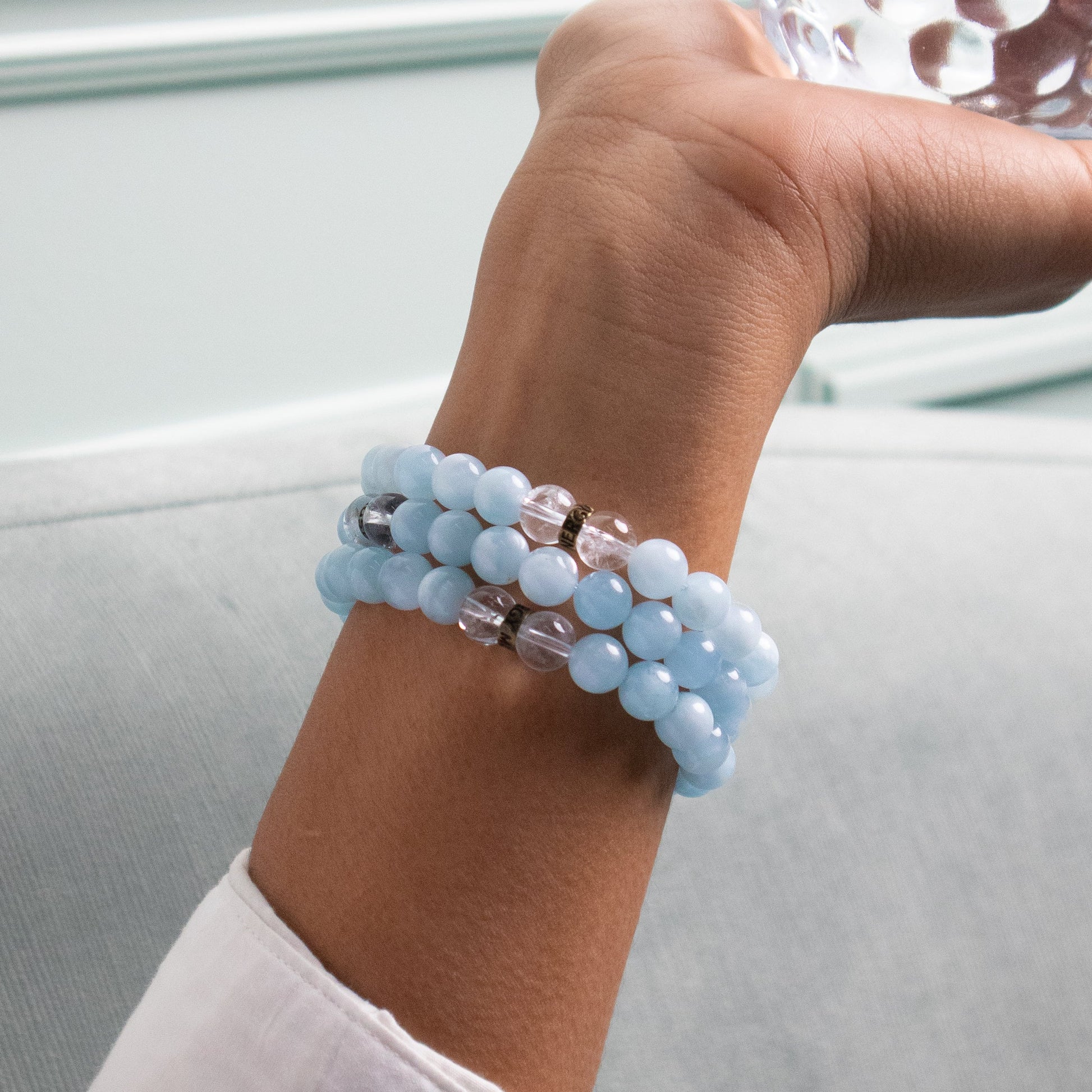 Harmony: Aquamarine crystals are renowned for their ability to bring harmony into your life. Just like the tranquil ocean waves, the soothing blue-green hues of Aquamarine exude a calming energy that resonates with the throat chakra. By adorning your wrist with this bracelet, you invite harmonious communication, inner peace, and balance. It acts as a gentle reminder to express yourself with grace and clarity.