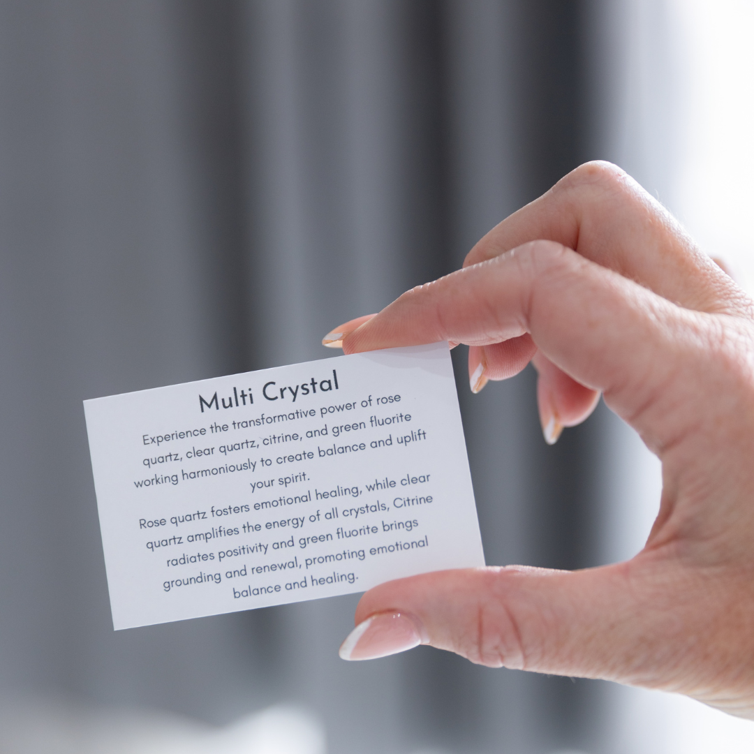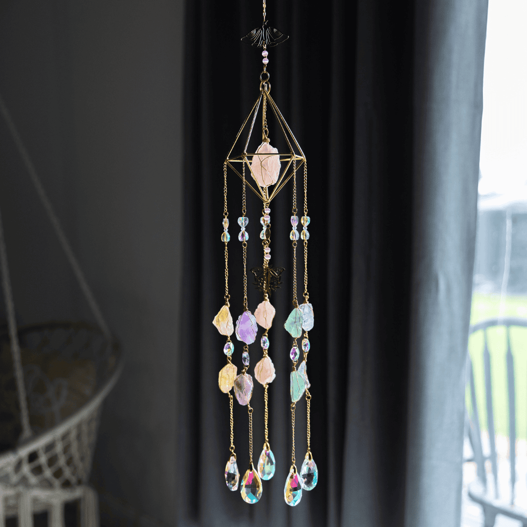 A masterpiece adorned with Amethyst, Rose Quartz, Citrine, Clear Quartz, and Green Fluorite — each crystal millions of years old and believed to offer unique spiritual gifts: calm, love, abundance, clarity, and balance. Together, they create a harmonious cascade of energy and color, filling your space with dancing rainbows and uplifting vibes.
