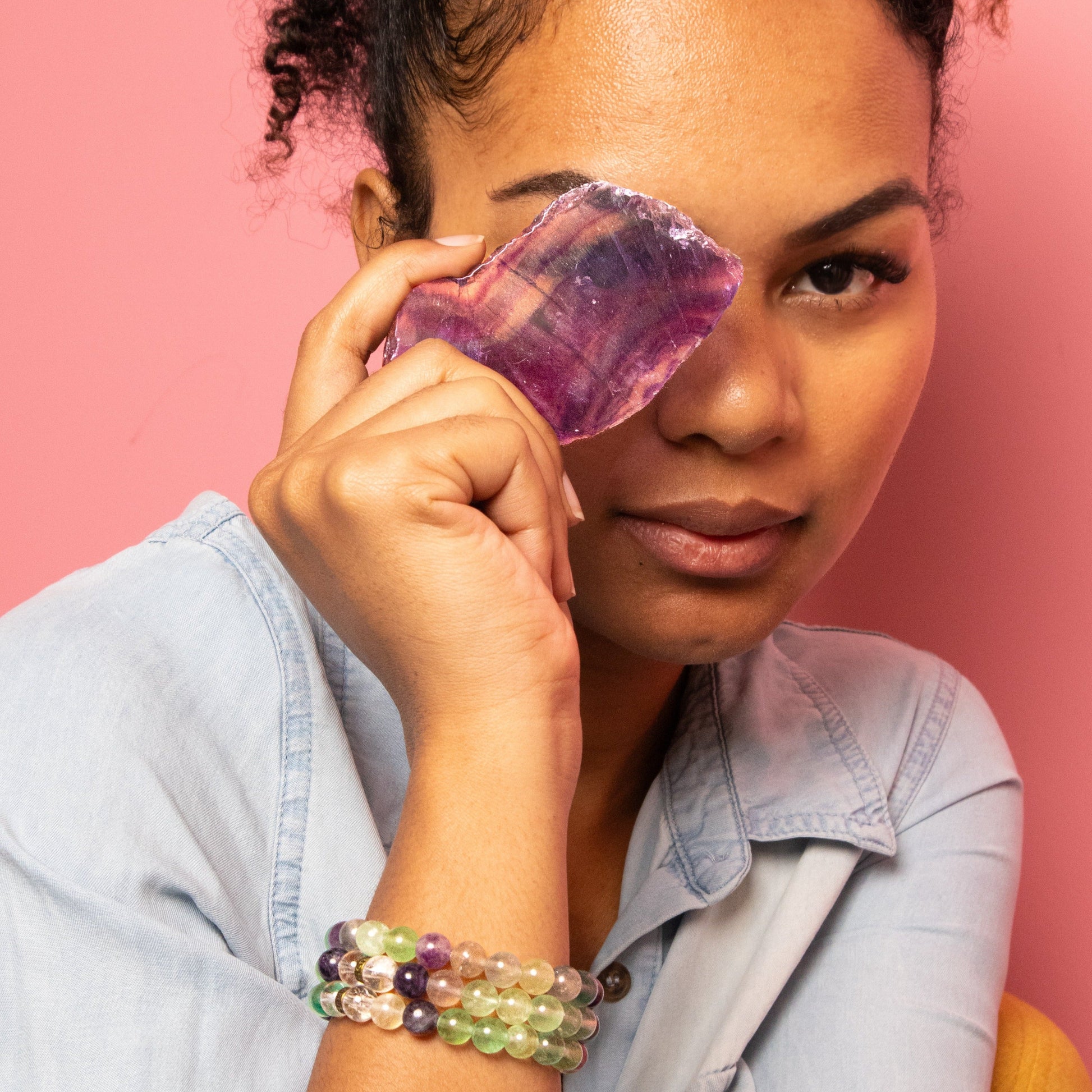 The come from its distinctive fluorescent light that features different colors when exposed to UV rays. This stone typically contains green and purple colors, giving it an incredible synergistic energy that heals and rejuvenates the aura. The green cleanses and purifies the heart chakra by aligning your mind with the true desires of the heart. The perfect prescription for a case of existential burnout, the purple colors in the Fluorite crystal beads help you discover your divine purpose in life. It opens and stimulates the third eye chakra, clearing the way for spiritual expansion and a deeper sense of inner peace. The otherworldly rainbow hues and Fluorite crystal healing properties fill your spirit with positive and high vibrational energy, which can encourage you to let go of inhibitions and dream big. This makes Fluorite one of the most powerful crystals for manifestation, as well as spiritual elevation.