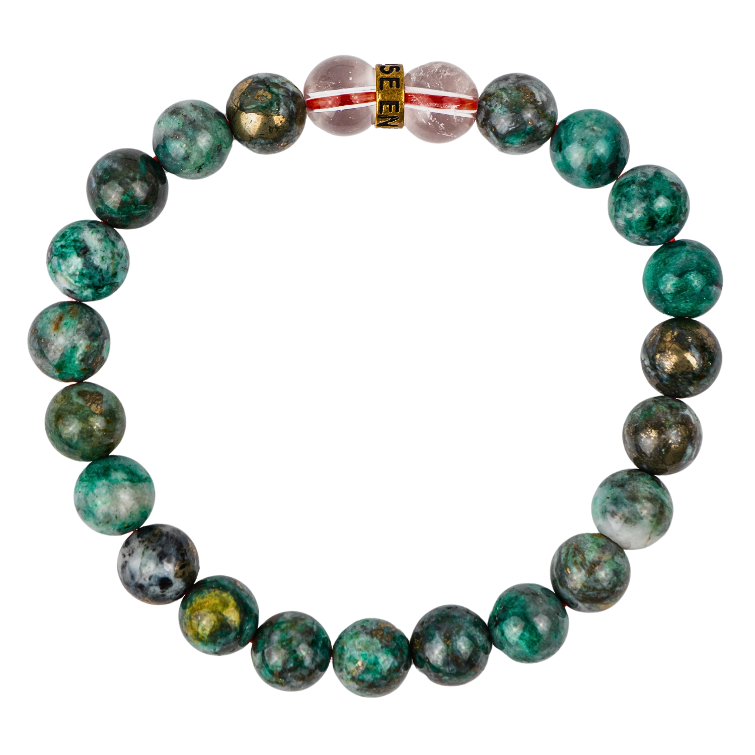 Discover the mesmerizing allure of our Jade with Pyrite Bracelet – a tantalizing fusion that's as powerful as it is beautiful. Hailing from the rich soils of Africa, this bracelet isn't just an accessory; it's a masterpiece featuring a remarkable hybrid stone that intertwines the lush vibrancy of Green Jade with the lustrous sheen of Pyrite.
